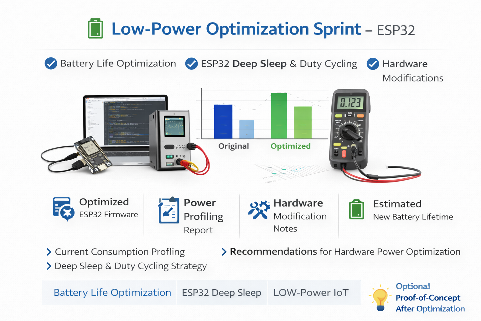 This fixed-scope optimization sprint is designed to identify, fix, and document power consumption issues in your ESP32-based device so you can confidently move toward pilot or production.